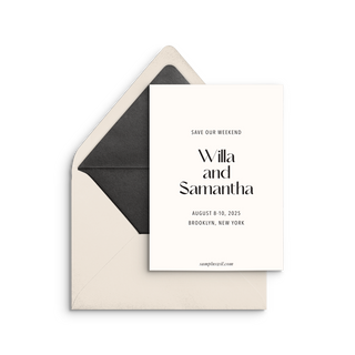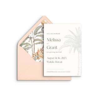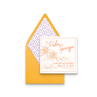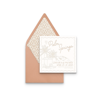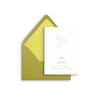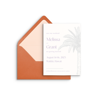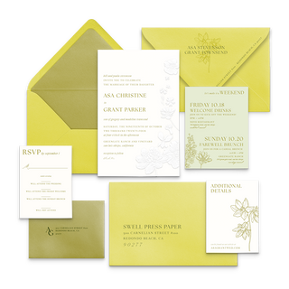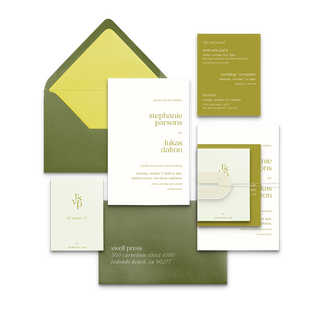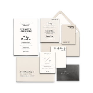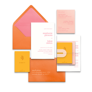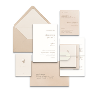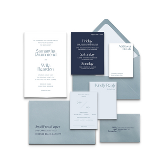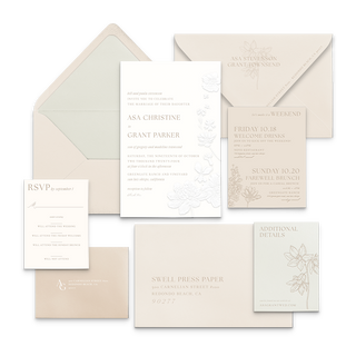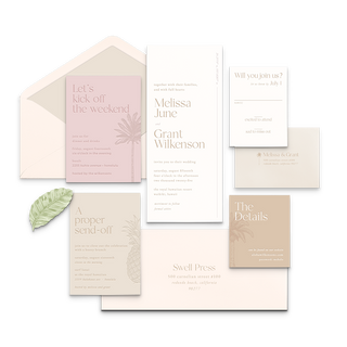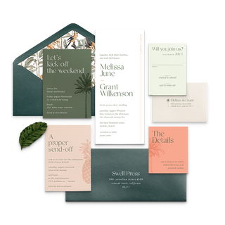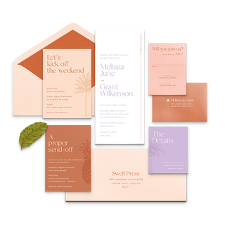 Choose the items to include in your wedding suite. At a minimum, you’ll need the invitation and outer envelope. We suggest including insert cards as well, such as a reply card (online or mail in), event insert, website insert, and anything else you'd like. Then, add any finishing touches to further personalize your set, like wax seals, envelope liners, and assembly. Not totally sure what finishing touches you want or if you’ll be up for assembling on your own? No sweat - leave them off for now, and we can check again once we’re in production!
